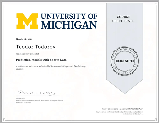 Тедо е Бакалавър по Софтуер Технологии и Дизайн. Освен това, той е сертифициран екперт от Мичиганския университет. Има и сертификат от Daekin за анализ на риск и възвращаемост в залозите. За него залозите са удоволствие, но и математика!